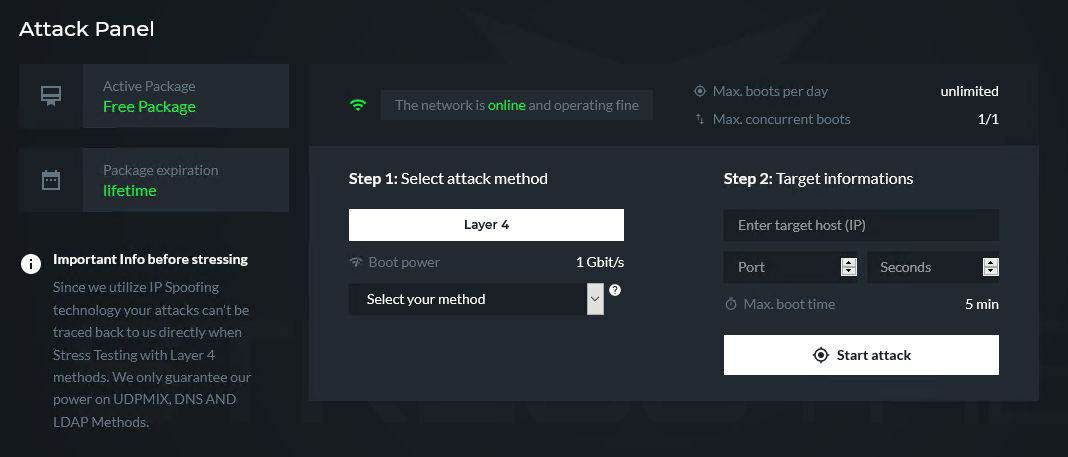 Once you\’re there all you have to do is fill in the IP and method you want, and the time in seconds, max time you can use on the free plan is 5 minutes (so 300 seconds)